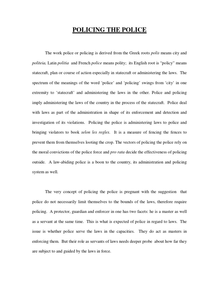 Did you ever wonder who solves those impossible cases you have seen on T, police essays. Well, surprisingly it is not the police essays officers, at least most of the time. It is Scientists, police essays. They study a science called Forensic Science. So, they take evidence and help out the police. The first part of Forensic Science is the history of it. A […], police essays. Police police essays is the systematic misuse of authority and abuse of police powers through the unwarranted infliction of bodily or psychological pain to civilians by law enforcers during their official duties. The routine enforcement of law using excessive force against unarmed civilians and the correctional misuse of facilities to manipulate, inflict, injure or subject a civilian to torture amounts to police brutality, police essays.